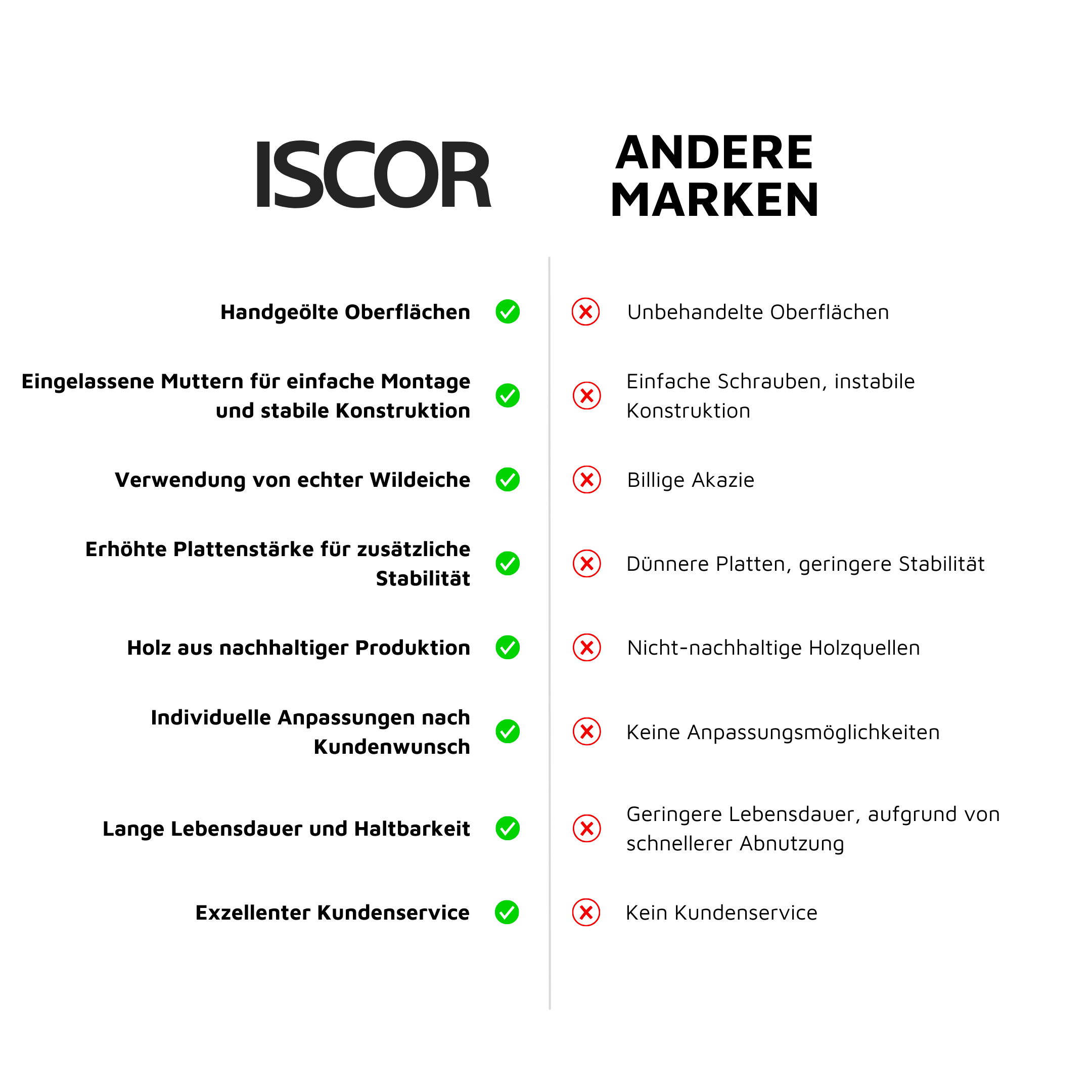 Entdecken Sie die außergewöhnliche Qualität unserer ISCOR Holztische. Unsere dreifach geölten Oberflächen bieten einen erstklassigen Schutz vor Wasserrändern und Flecken, sodass Ihr Tisch stets makellos bleibt. Dank eingelassener Muttern sind unsere Tische einfach zu montieren und bieten eine besonders stabile Konstruktion. Wir verwenden ausschließlich echte Wildeiche, die durch ihre edle Optik und außergewöhnliche Haltbarkeit besticht – im Gegensatz zu billiger Akazie.