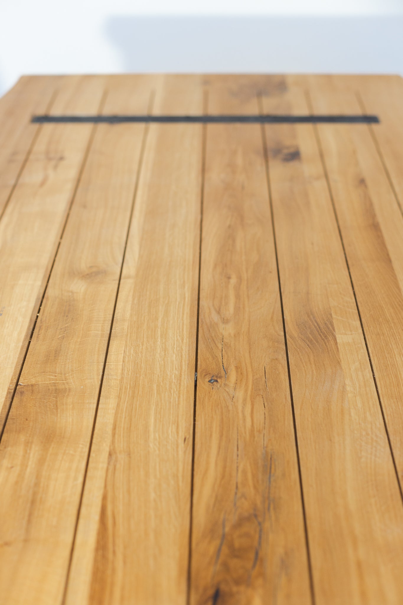 Der Esstisch ARBORIS besteht aus vollmassiver Wildeiche. Die Tischplatte hat eine natürliche Baumkante und ist dreifach geölt, was für eine langlebige und strapazierfähige Oberfläche sorgt.