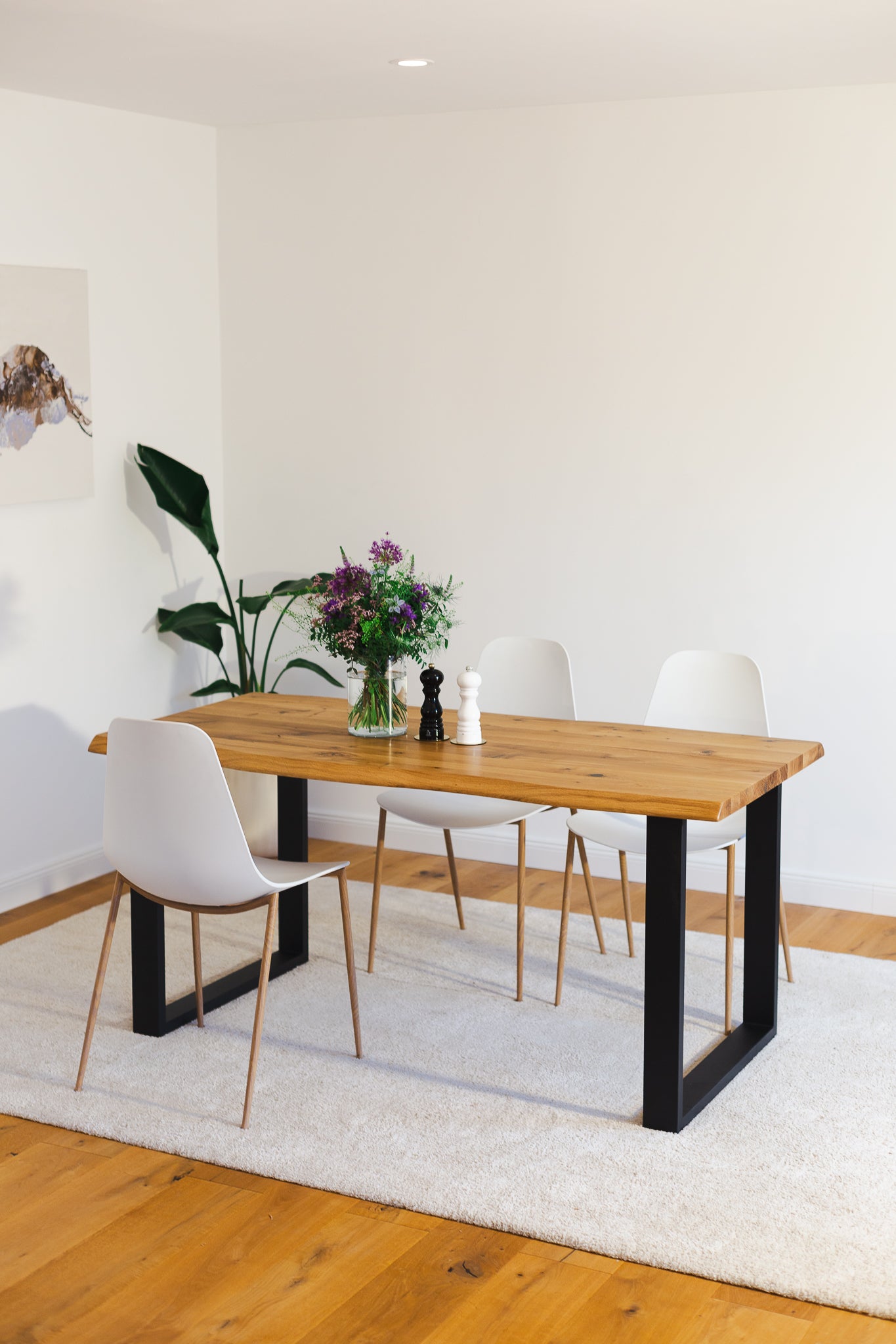 Für die Herstellung des ARBORIS wird wie bei allen Produkten massives Eichenholz verwendet, das durch das schwarz gepulverte, zweiteilige U-förmige Gestell besonders zur Geltung kommt. Die Tischplatte ist in zwei stilvollen Varianten erhältlich: Eiche natur für eine warme, authentische Ausstrahlung oder Eiche schwarz geköhlt für einen modernen, markanten Look. Besonders charakteristisch sind die Baumkanten an den langen Seiten der Platte, die an die ursprüngliche Bohle erinnern und dem Tisch eine natürliche, organische Note verleihen und nicht nur für Schmetterlinge im Bauch, sondern auch für eine harmonische Atmosphäre in jedem Raum sorgen.