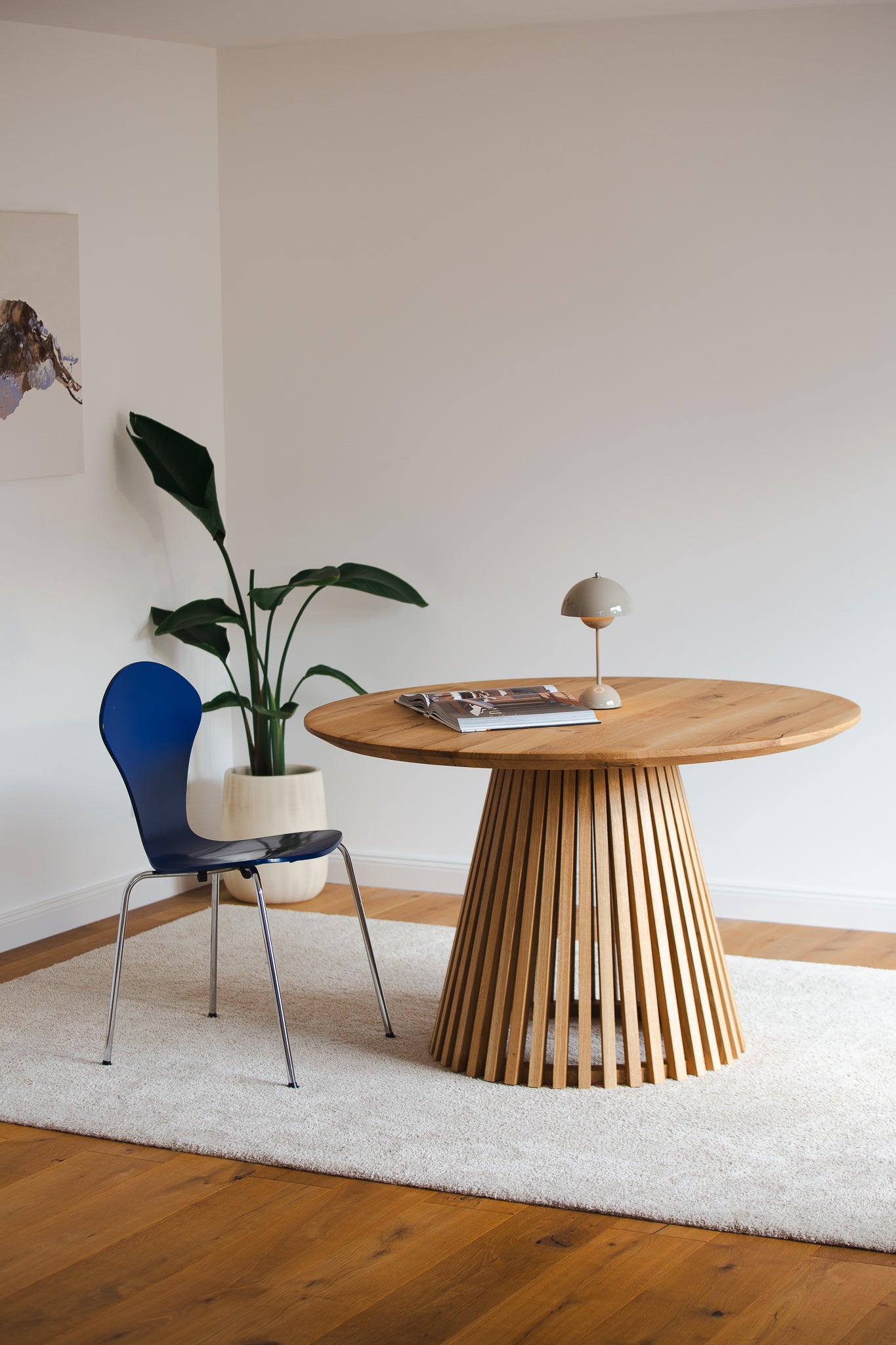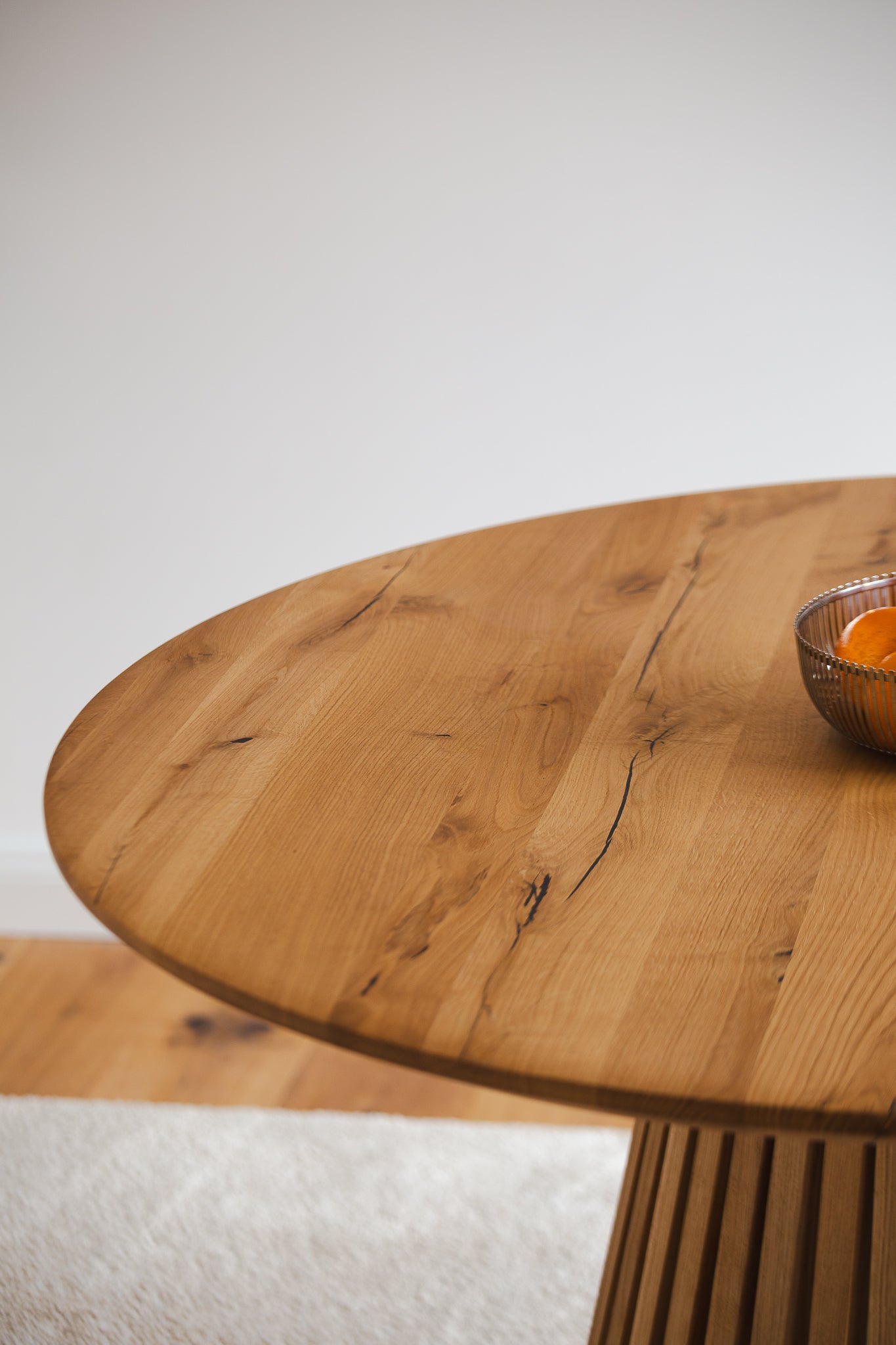 Verleihen Sie Ihrem Esszimmer mit diesem runden Esstisch aus Eiche einen Hauch von Natur und Stil. Ideal für Familienessen, Dinnerpartys oder als zentraler Treffpunkt in Ihrem Zuhause.